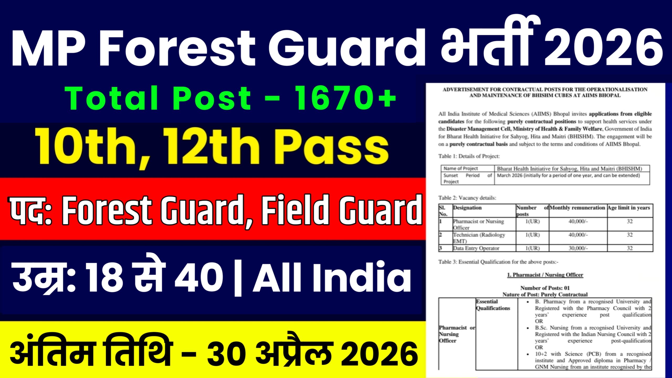 दोस्तो 2026 में Employee Selection Board (MPESB) में आई है नई भर्ती जिसके लिए सभी लोग ऑनलाइन आवेदन करेंगे जोकि MP Forest Guard में भर्ती पाने वालों के लिए ये एक शानदार मौका है. इच्छुक उम्मीदवार भर्ती के लिए आयु सीमा, शैक्षणिक योग्यता, और आवेदन की अंतिम तिथि, भर्ती प्रक्रिया, साथ में सभी महत्वपूर्ण दस्तावेज और फॉर्म भरने की प्रक्रिया आदि महत्वपूर्ण जानकारी देख सकते हैं विस्तृत जानकारी के लिए esb.mp.gov.in नोटिफिकेशन को देखें सारी जानकारी को अच्छे से पढ़े, जिसका लिंक नीचे दिए गए हैं।